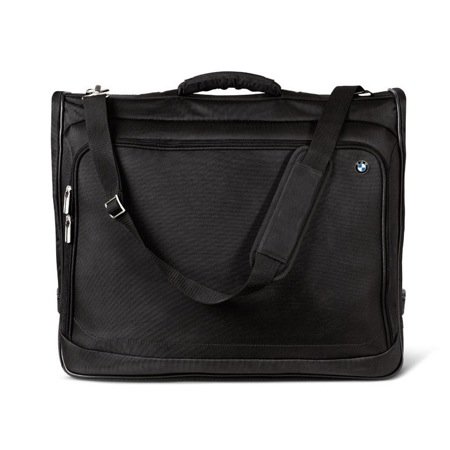 Genuine BMW Garment Bag?Hanging bag has padded, adjustable shoulder strap. Features a spacious main compartment with multiple pockets, and a large front pocket with two-way zipper. Open, measures 42.5"h x 22"w x 4"d. Folds to 21.5"h x 22"w x 8"d. Import.